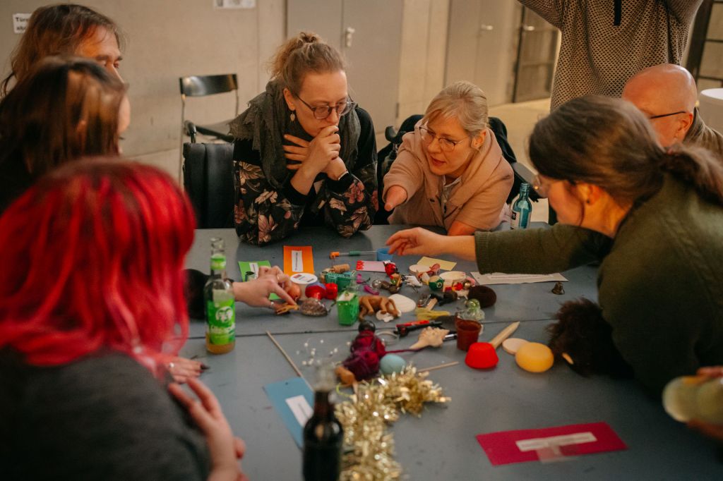 Sind alle Gegenstände platziert, darf die Augenbinde abgenommen werden, und beide vergleichen die blind rekonstruierte Installation mit dem Originalfoto.